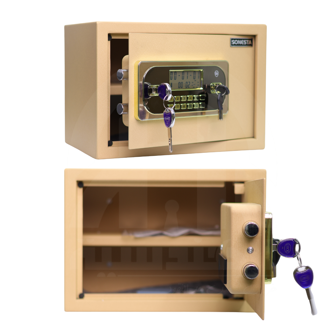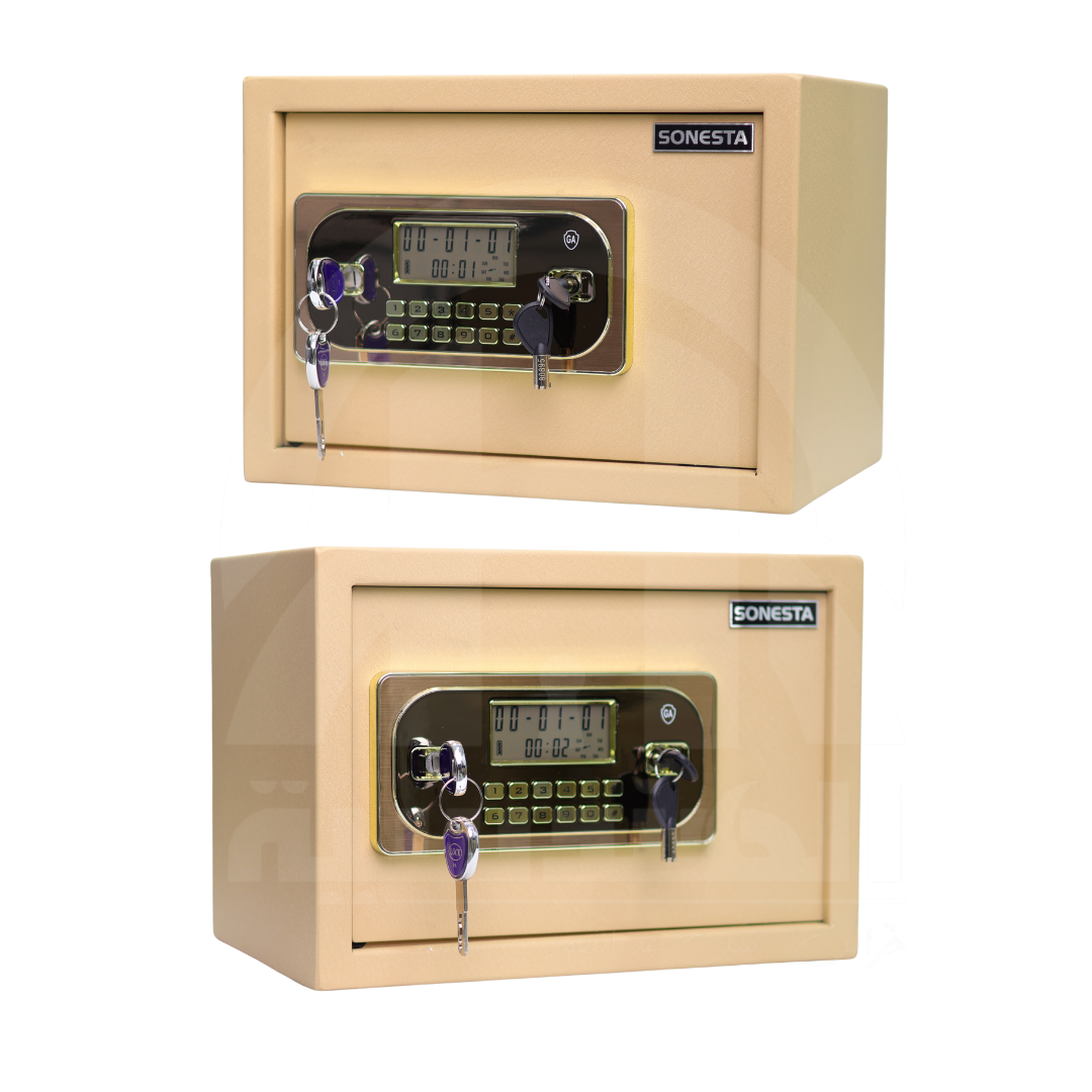 خزنة فندقية ومنزلية ومكتبية من ماركة سونستا SONESTA العالمية، مزودة بنظام قفل مزدوج يجمع بين كلمة السر الإلكترونية و2 قفل (كالون) ميكانيكي مع رف داخلي لتنظيم محتويات الخزنة.