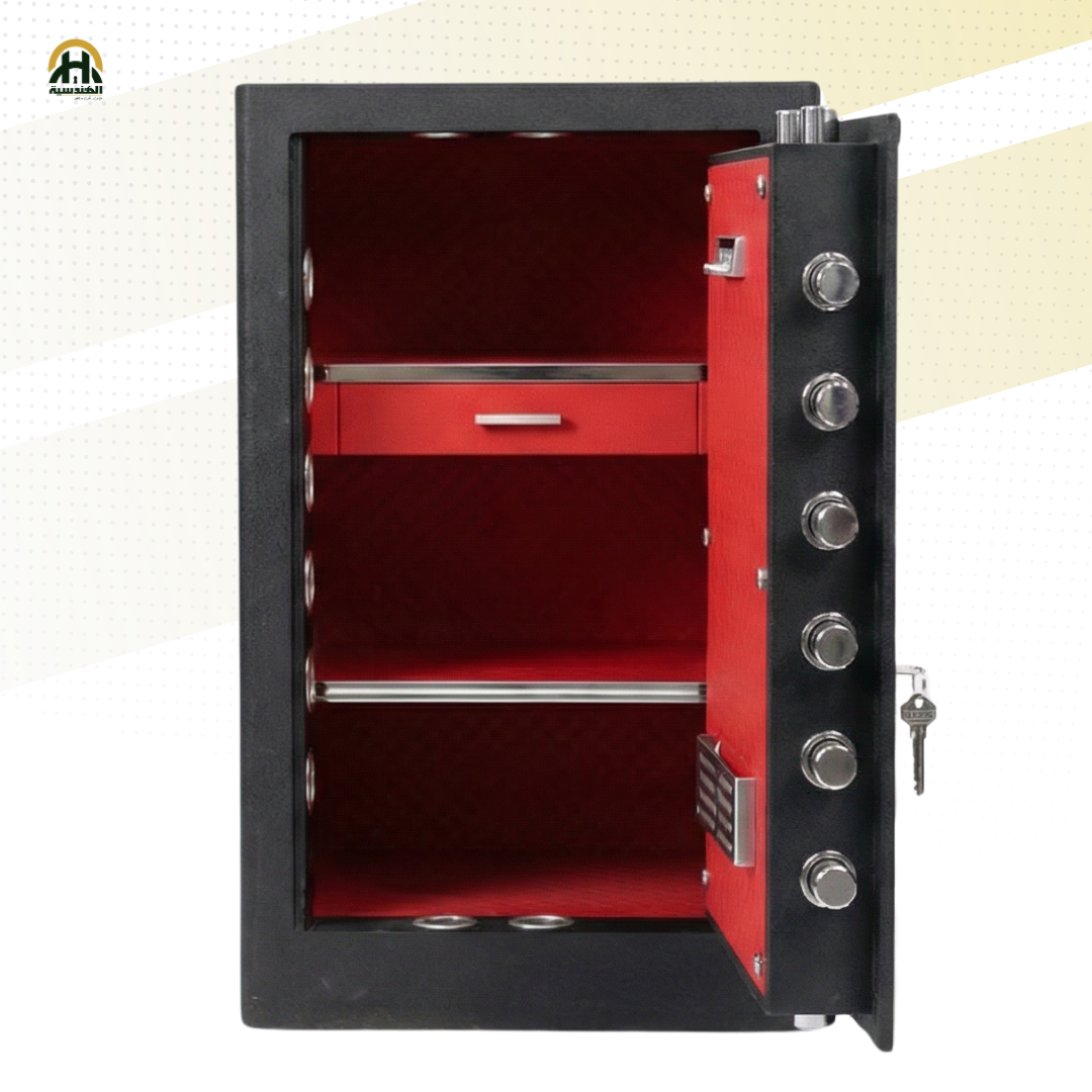 امتلك السيادة والأمان مع خزنة هامر (HAMMER) مقاس 80 سم، الموديل الأضخم والأثقل في الكولكشن بوزن 75 كجم. صُممت هذه الخزنة لتوفير أقصى درجات الحماية بفضل هيكلها الفولاذي وسعتها التخزينية التي تستوعب كافة مقتنياتك الثمينة والمستندات الضخمة بوضعية منظمة وآمنة.
