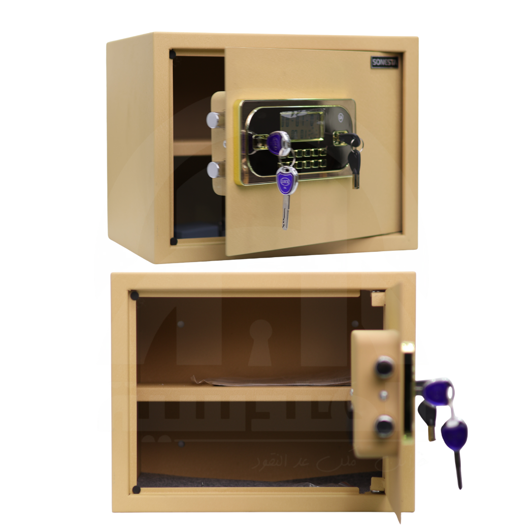 استثمر في راحة بالك مع خزنة سونستا التي تجمع بين الأمان المتقدم والفخامة العصرية. نظام قفل مزدوج (إلكتروني وميكانيكي) مع ملمس قطيفة راقي ولوحة أمان بتصميم حديث وشيك.